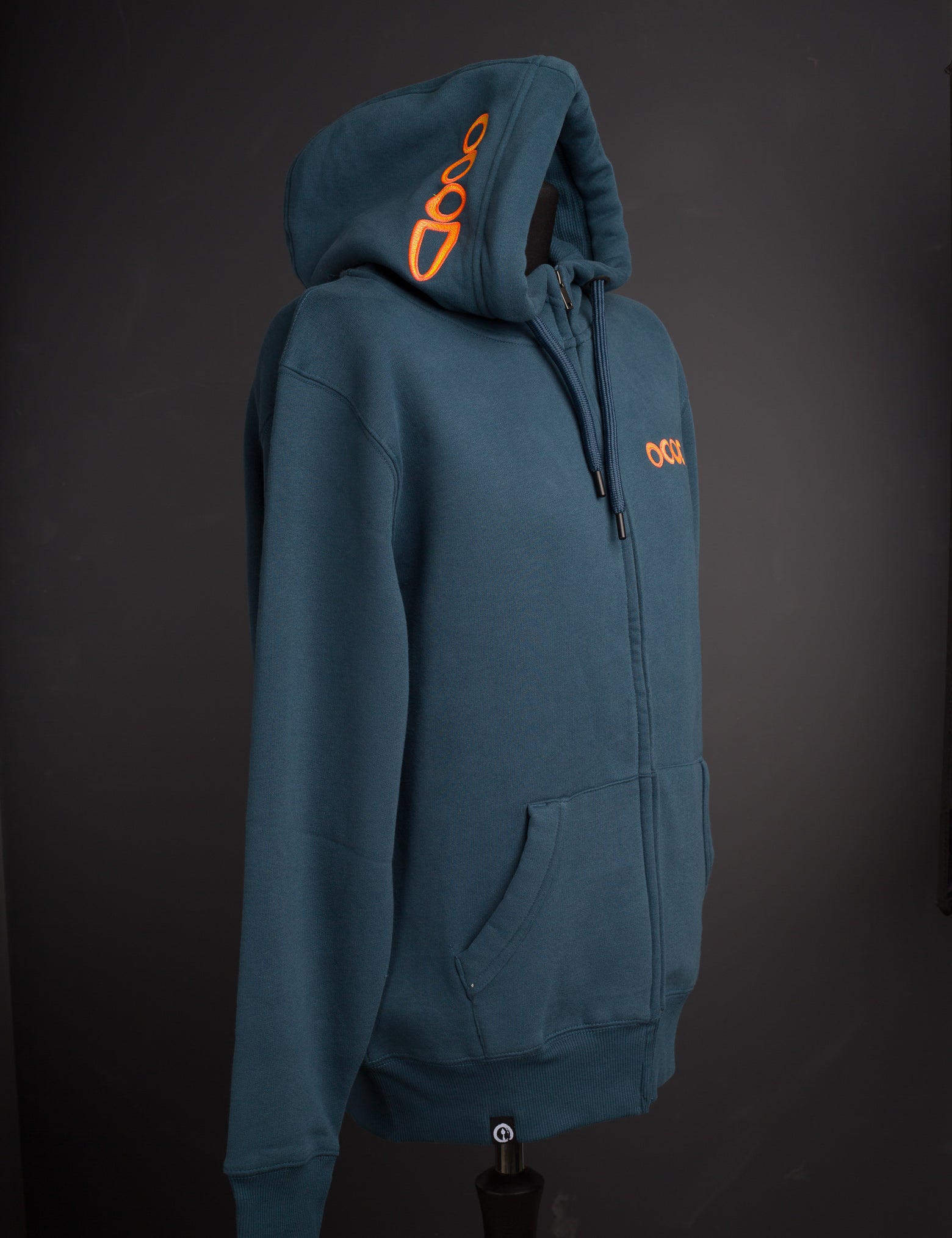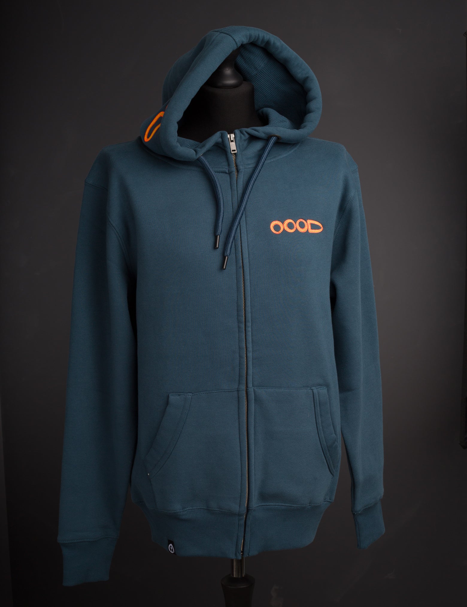 Super high quality embroidered UV Fluorescent design on hoodie back, with UV Fluro embroidered OOOD logo on hood and chest.