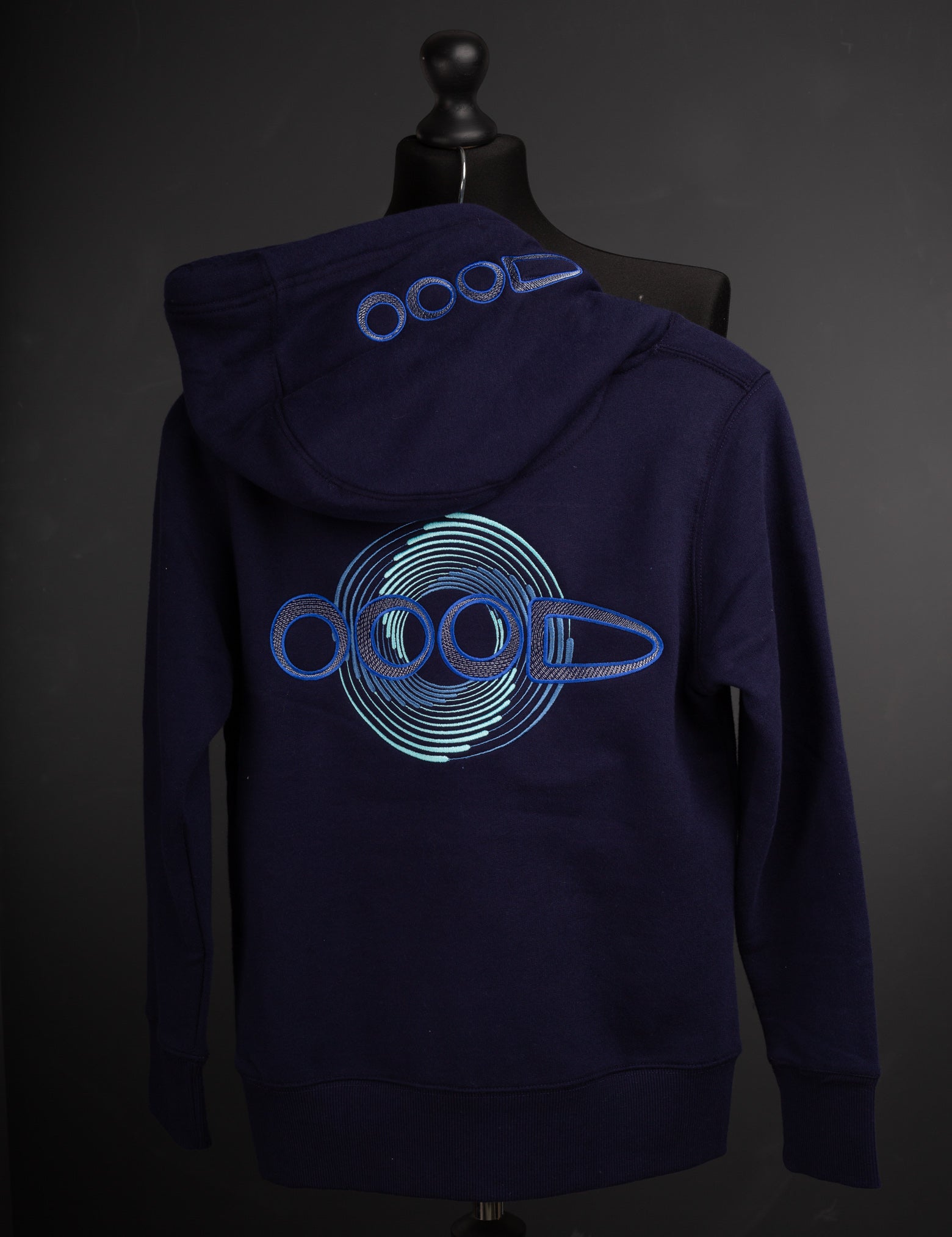 The understated and sophisticated OOODie, a monochrome spiral on a oxford blue hoodie.