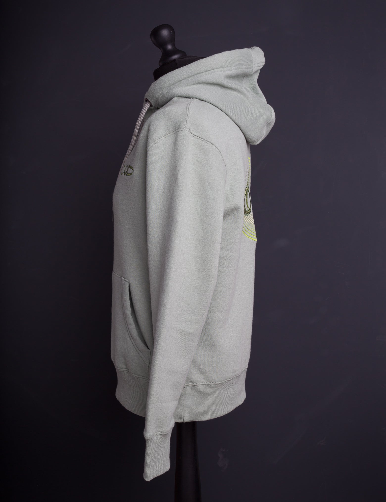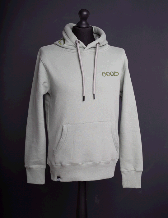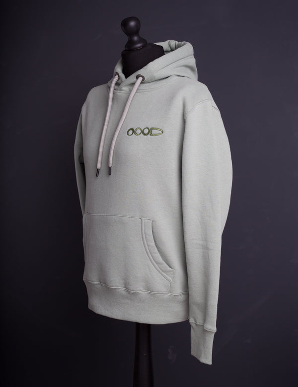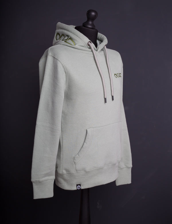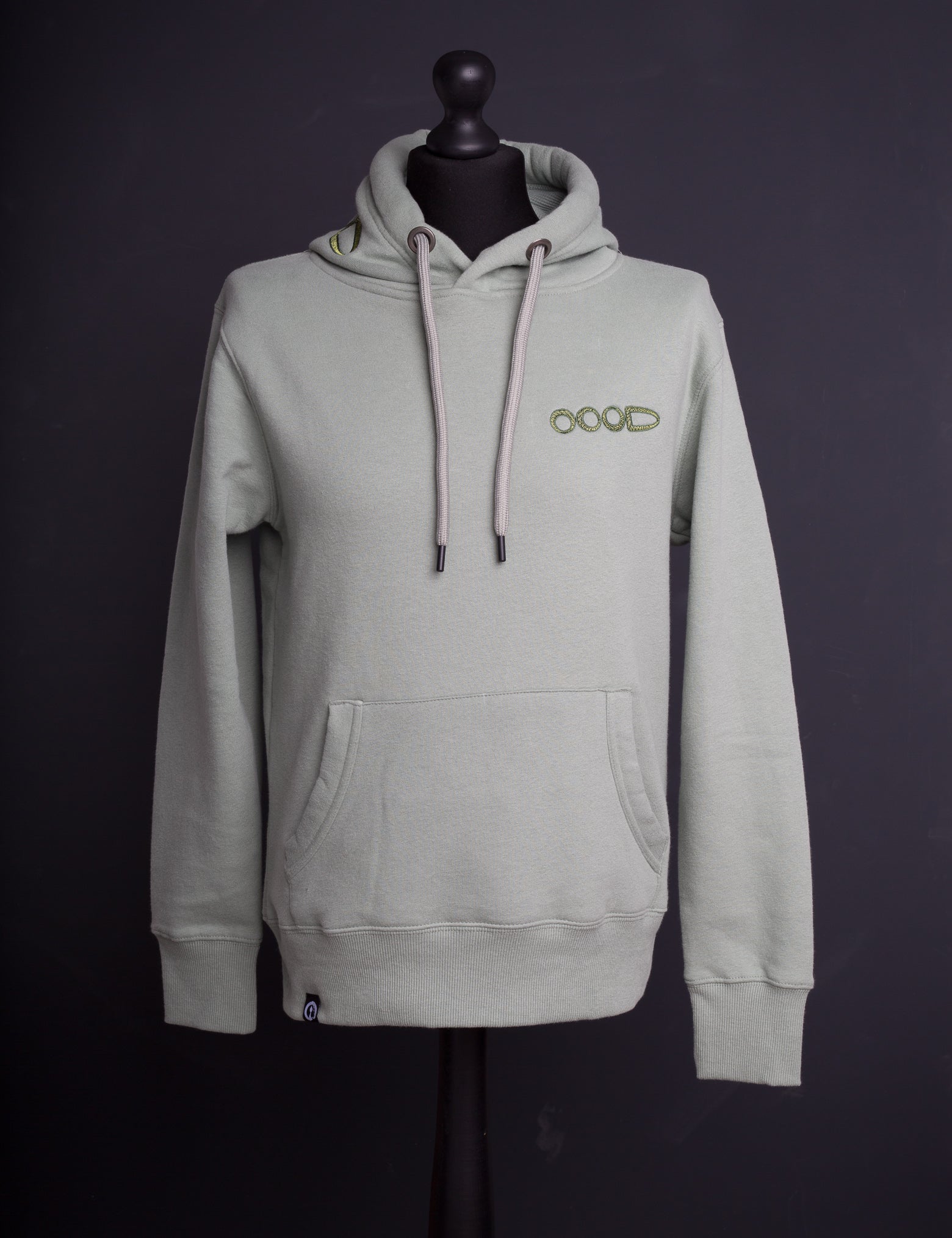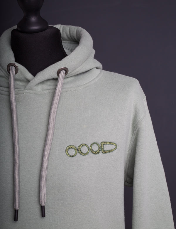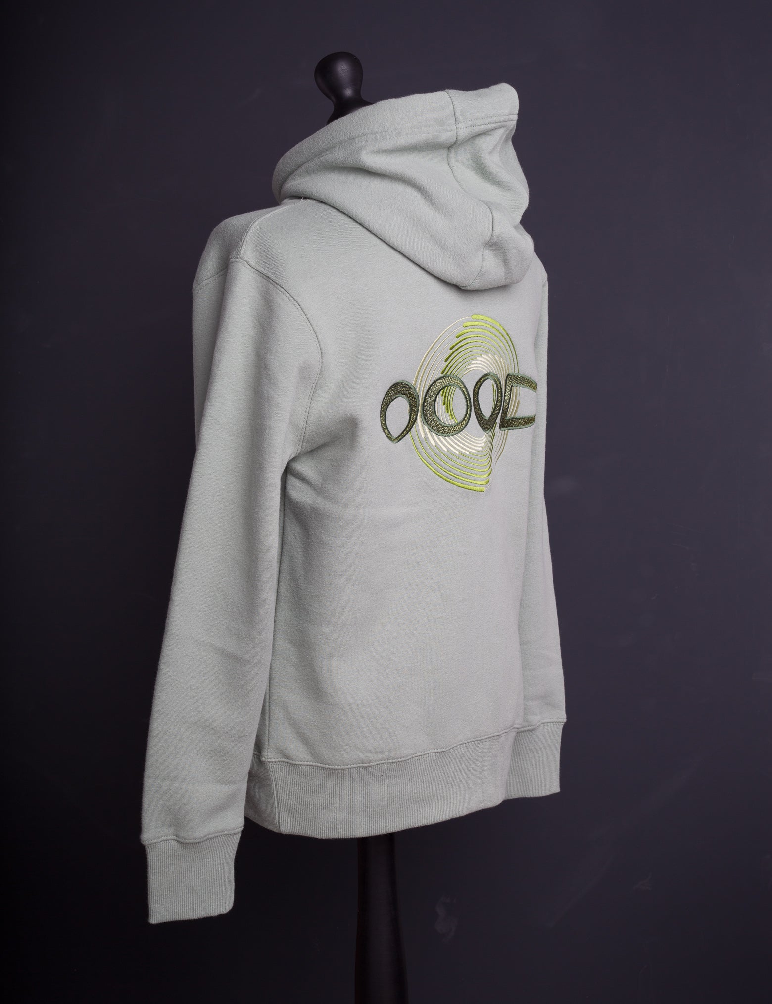 The understated and sophisticated OOODie, a monochrome spiral on a sage green Hoodie.