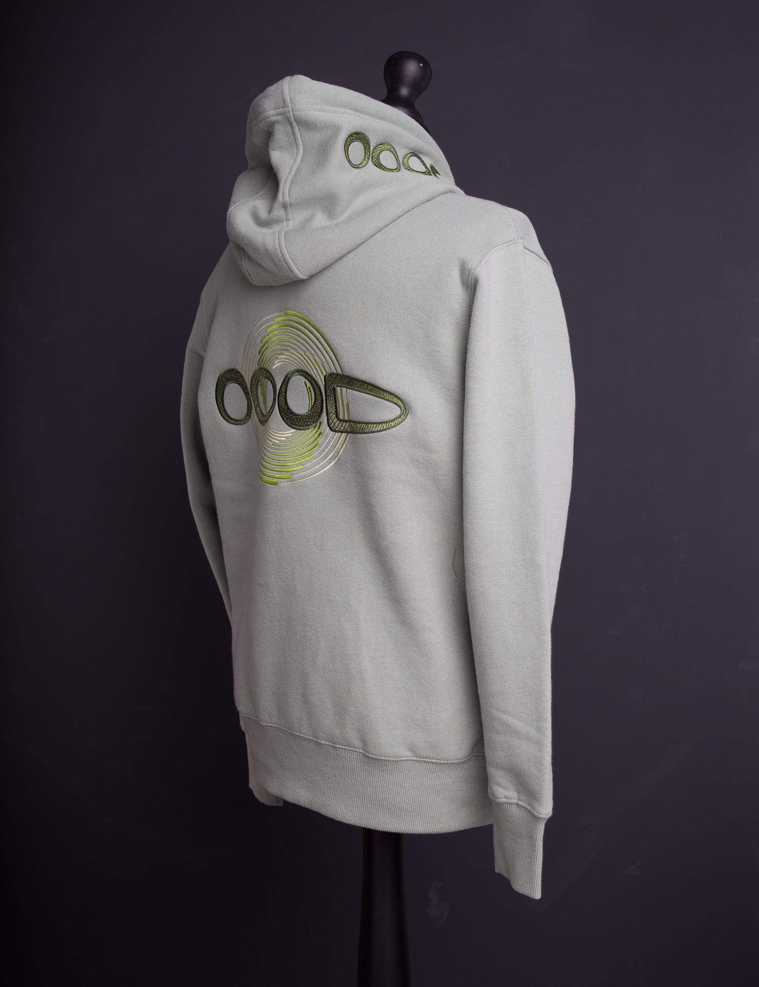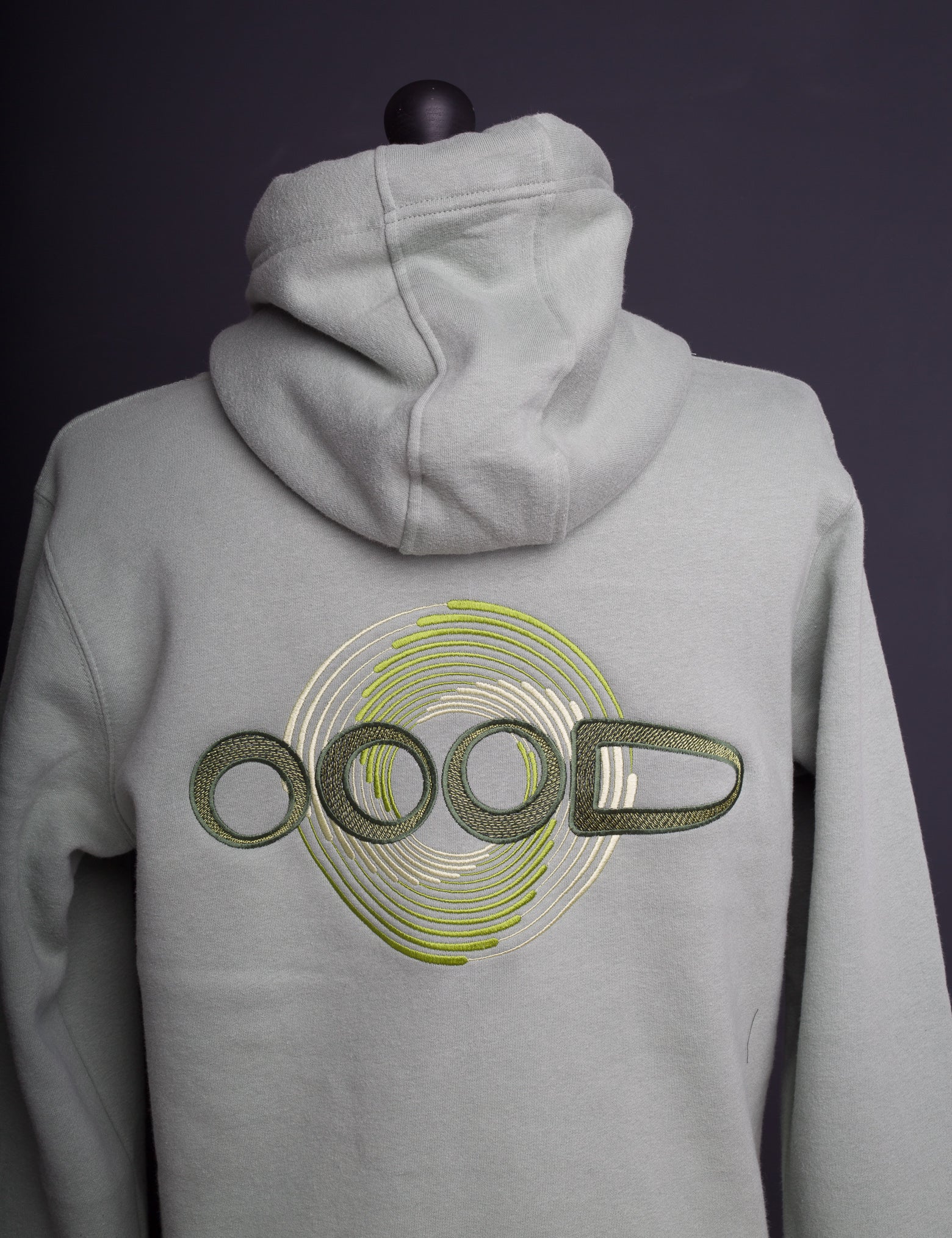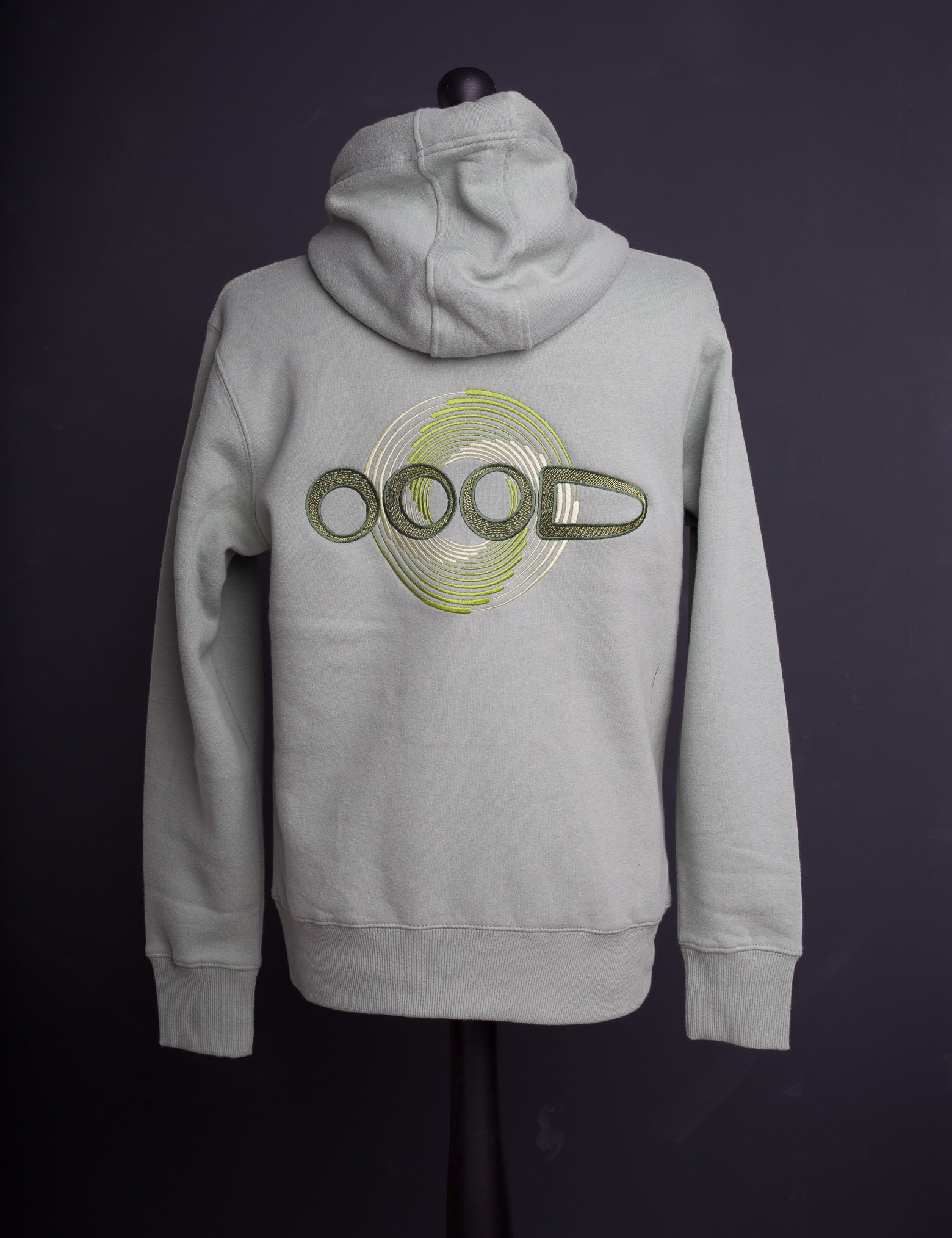 Super high quality embroidered monochrome design on hoodie back, with embroidered OOOD logo on hood and chest.