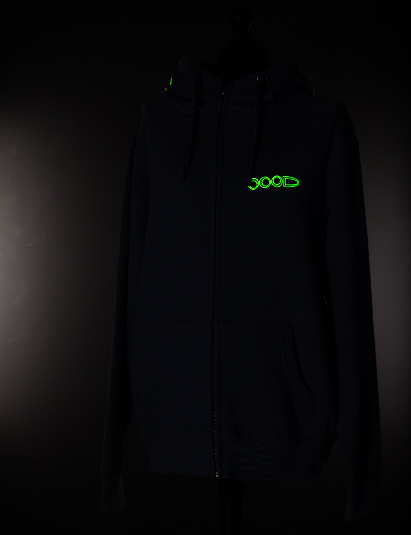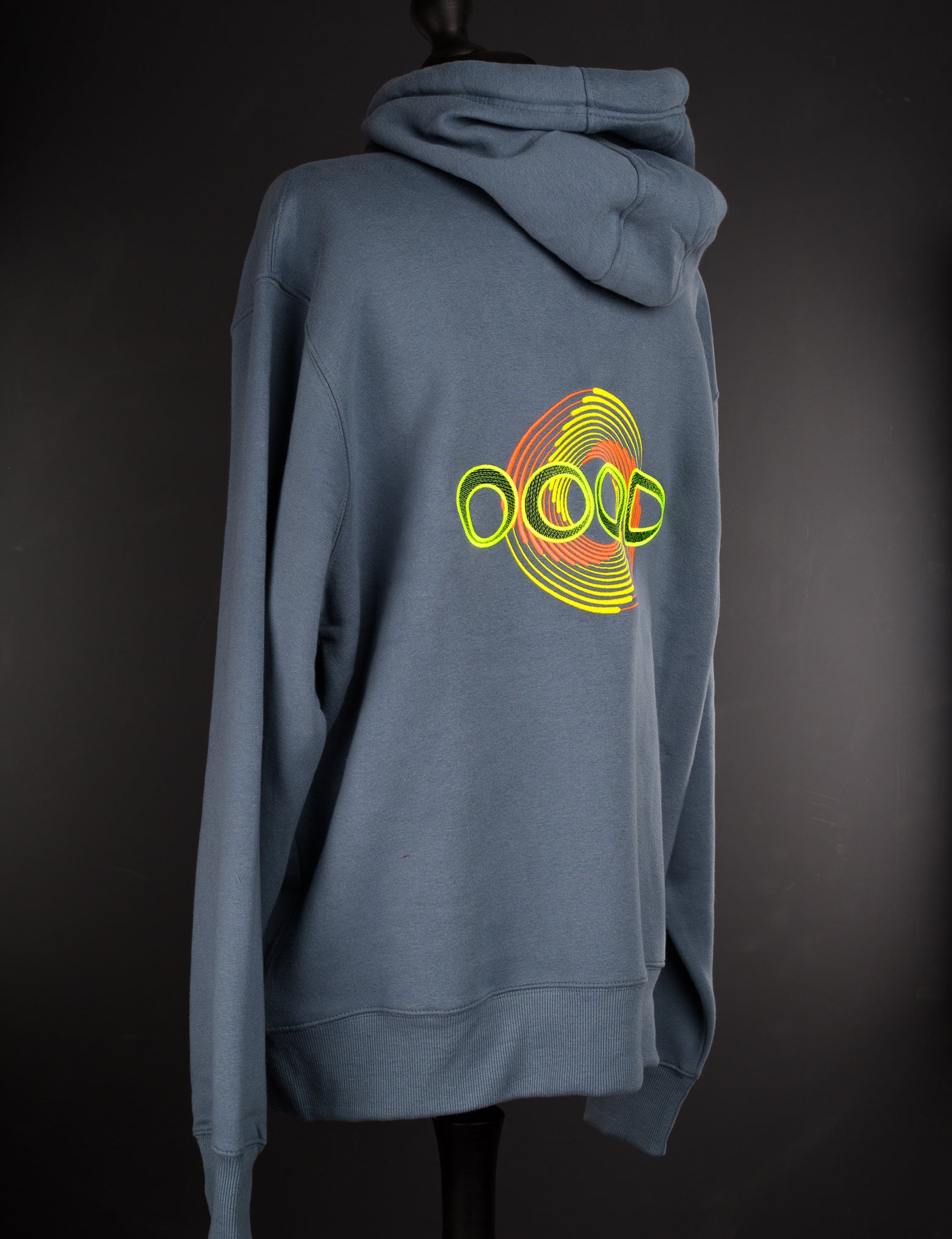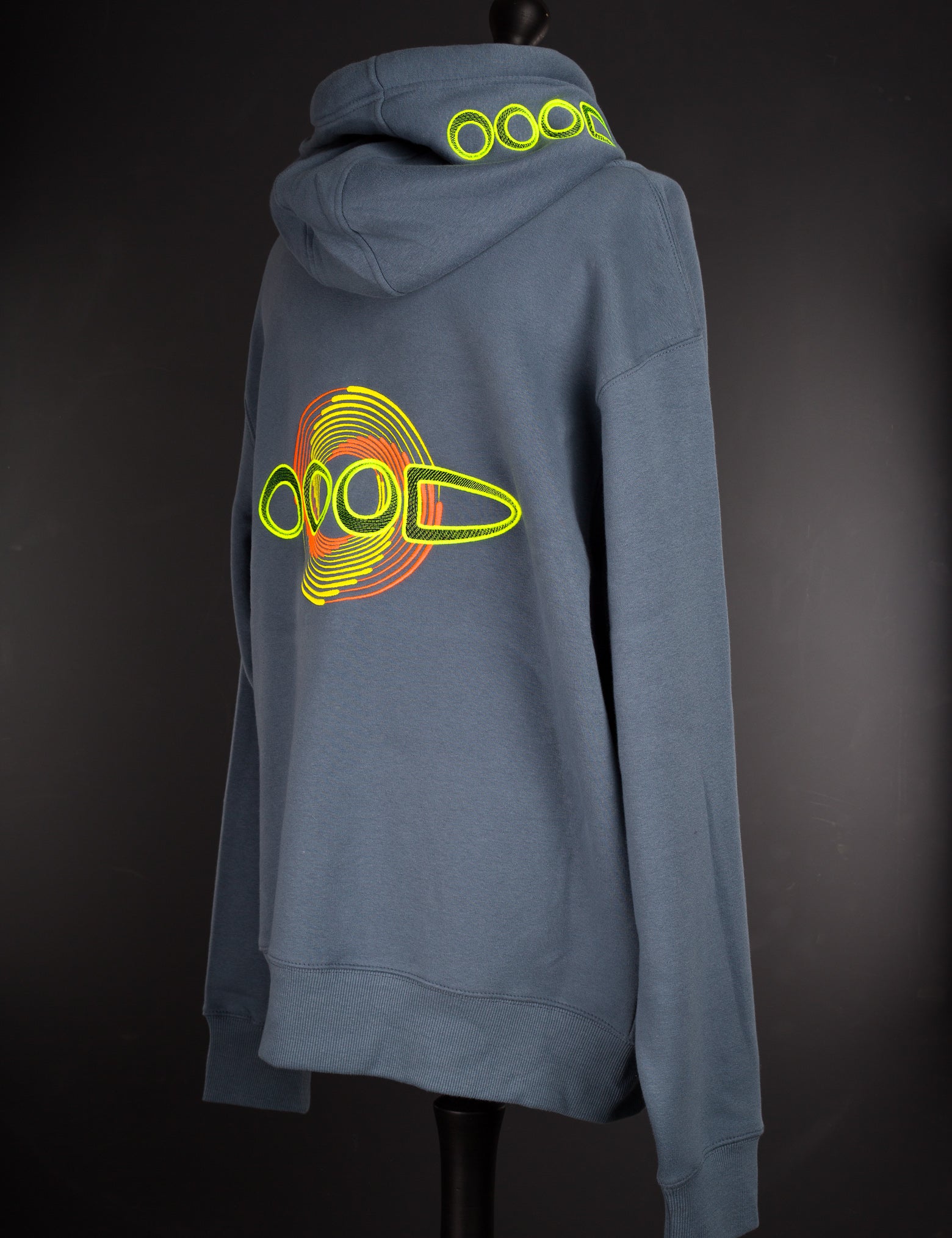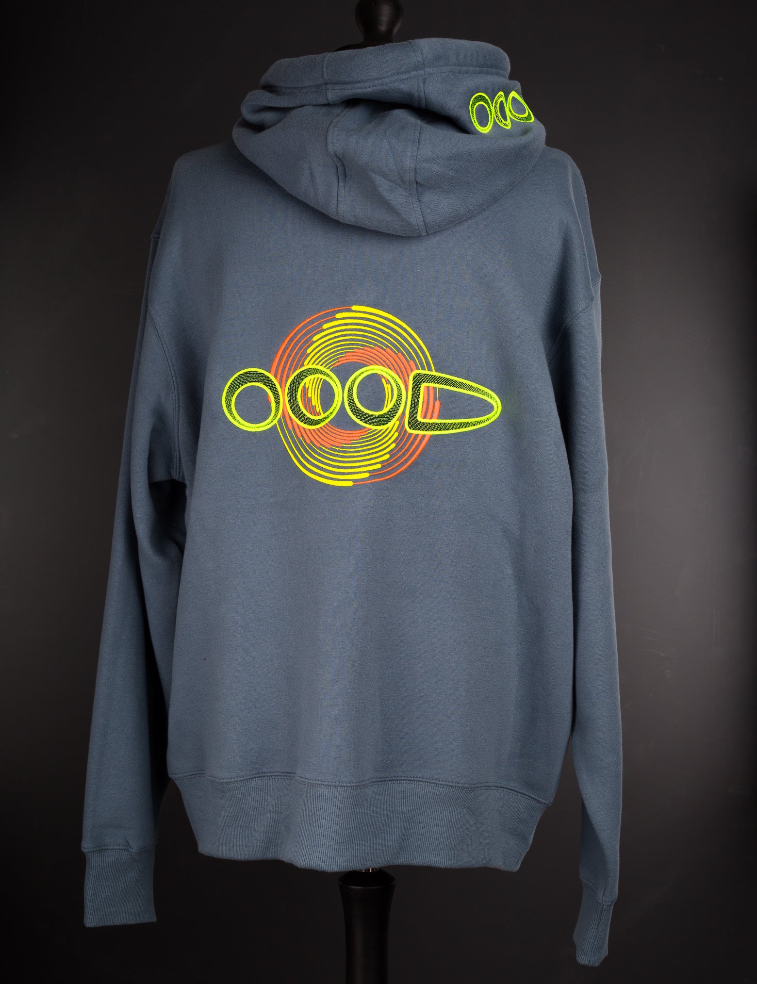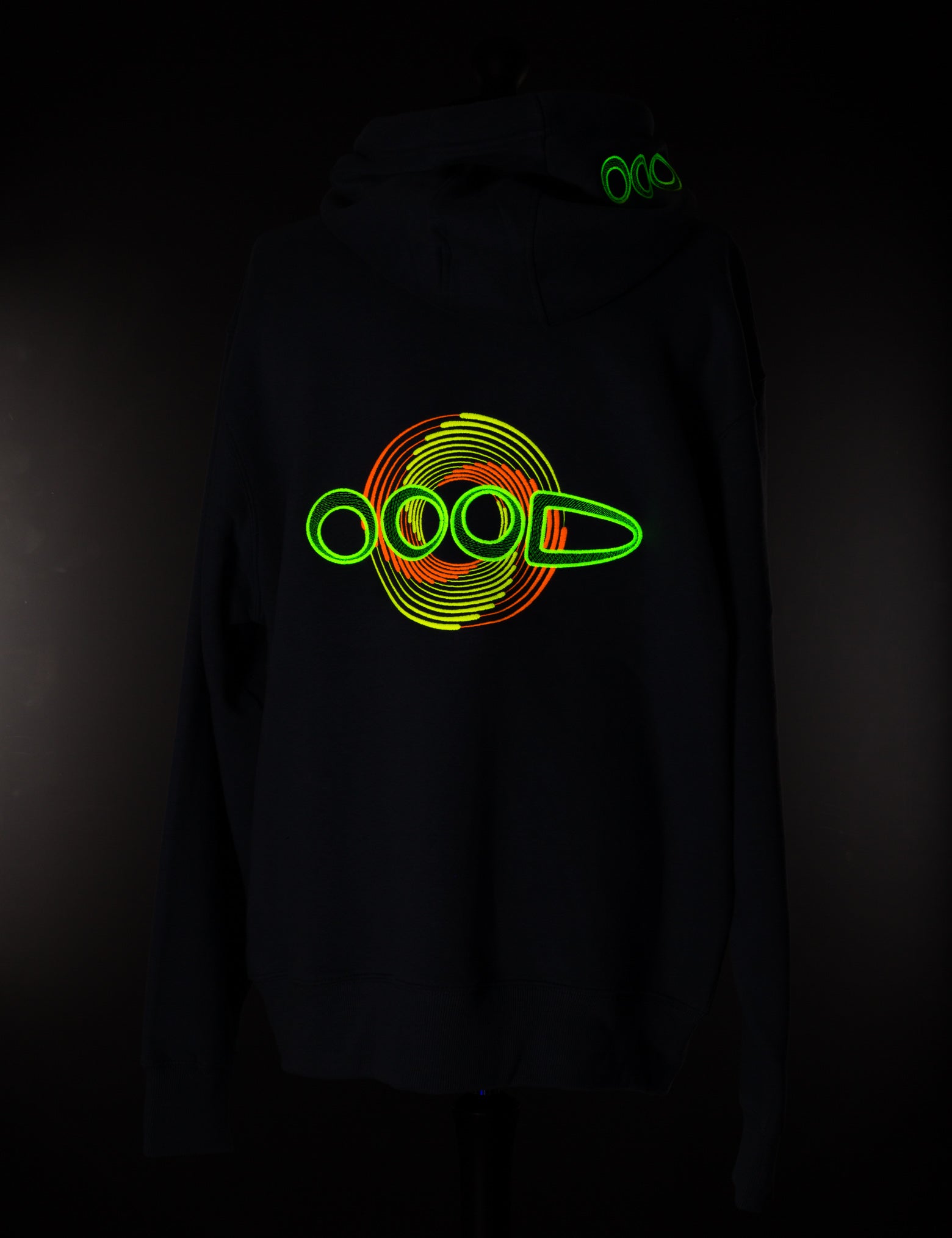 Super high quality embroidered UV Fluorescent design on hoodie back, with UV Fluro embroidered OOOD logo on hood and chest.