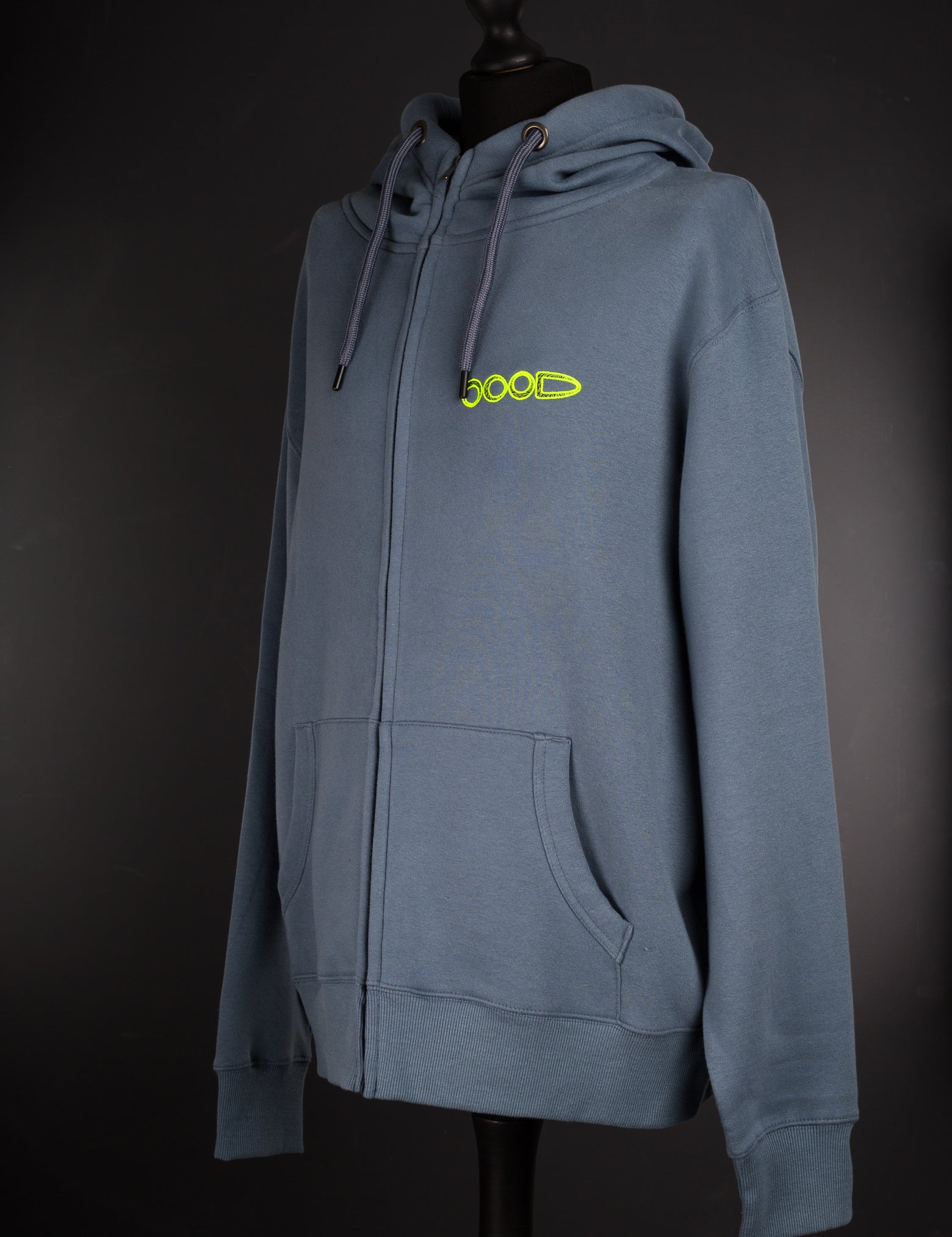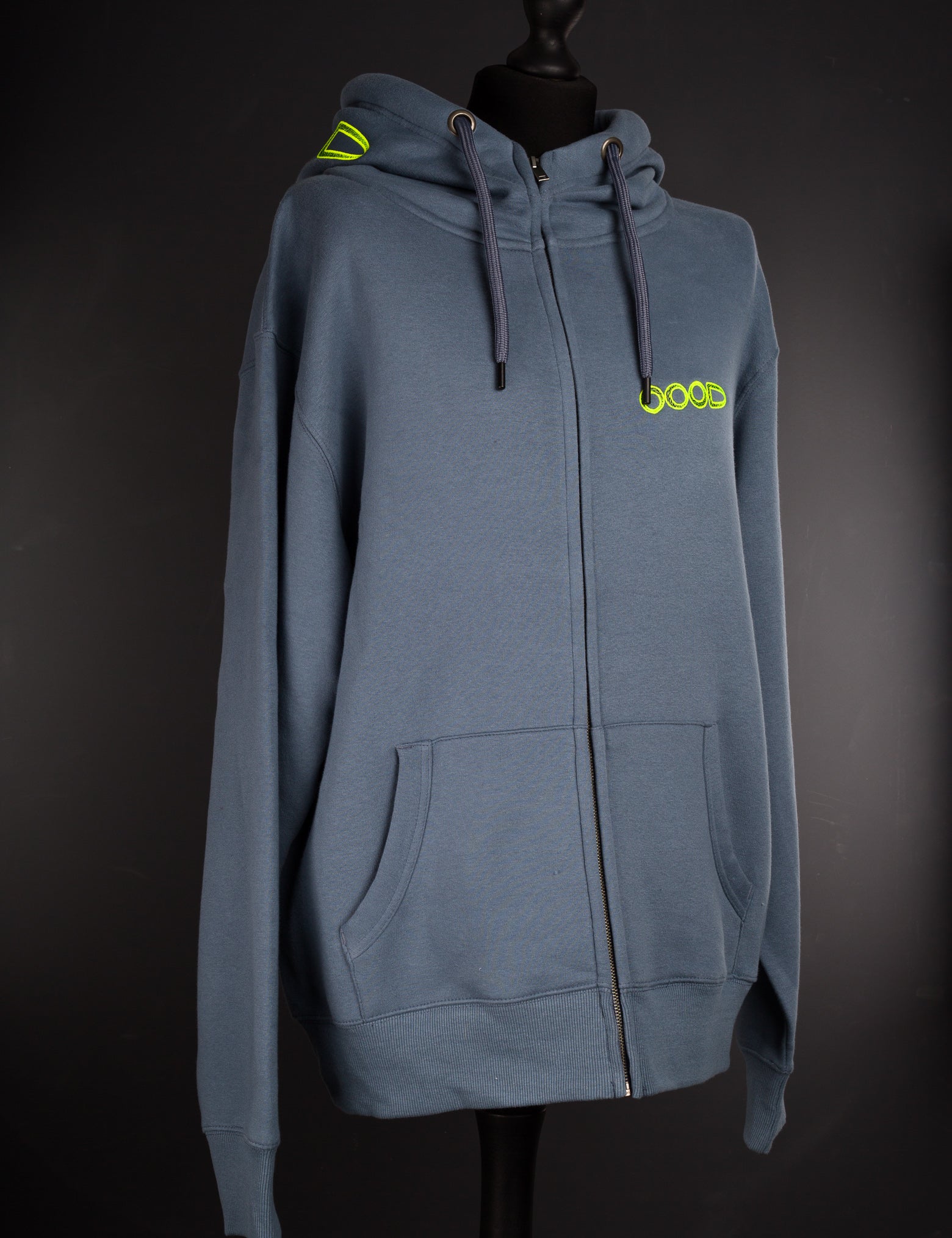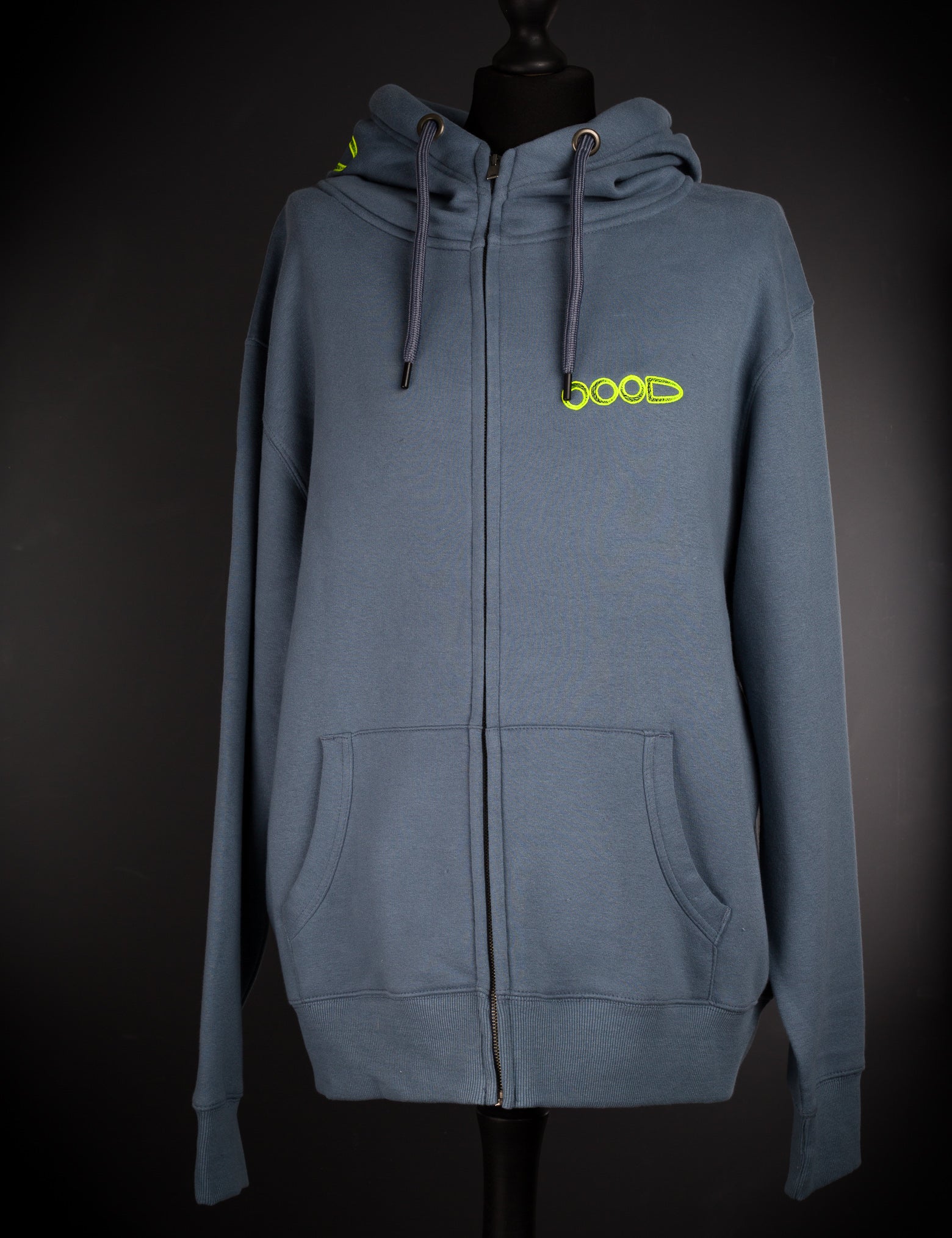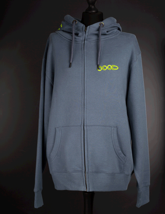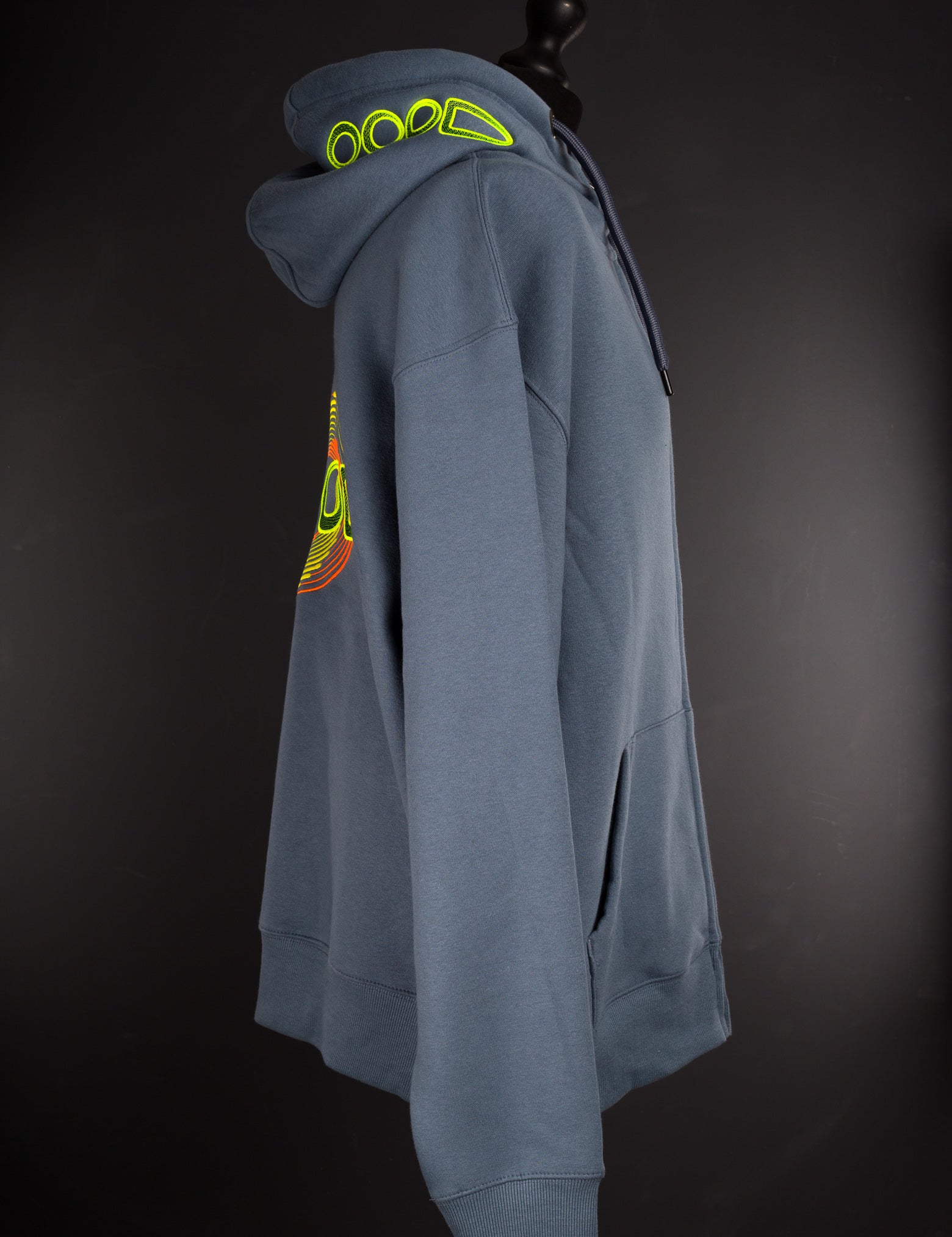 Super high quality embroidered UV Fluorescent design on hoodie back, with UV Fluro embroidered OOOD logo on hood and chest.