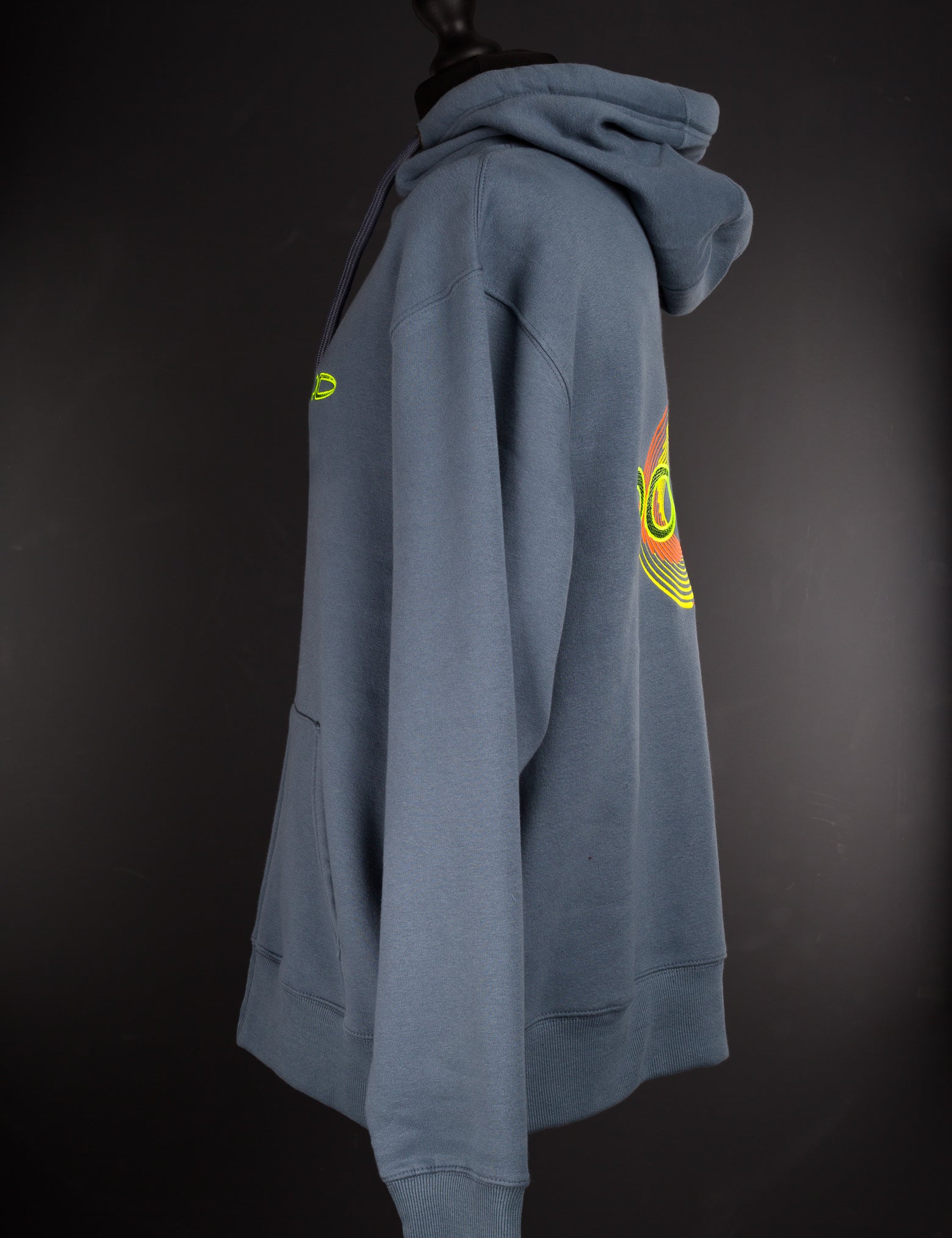 Glowing in UV, this super sophisticated OOODie features a UV active fluro spiral design on a stone blue hoodie.